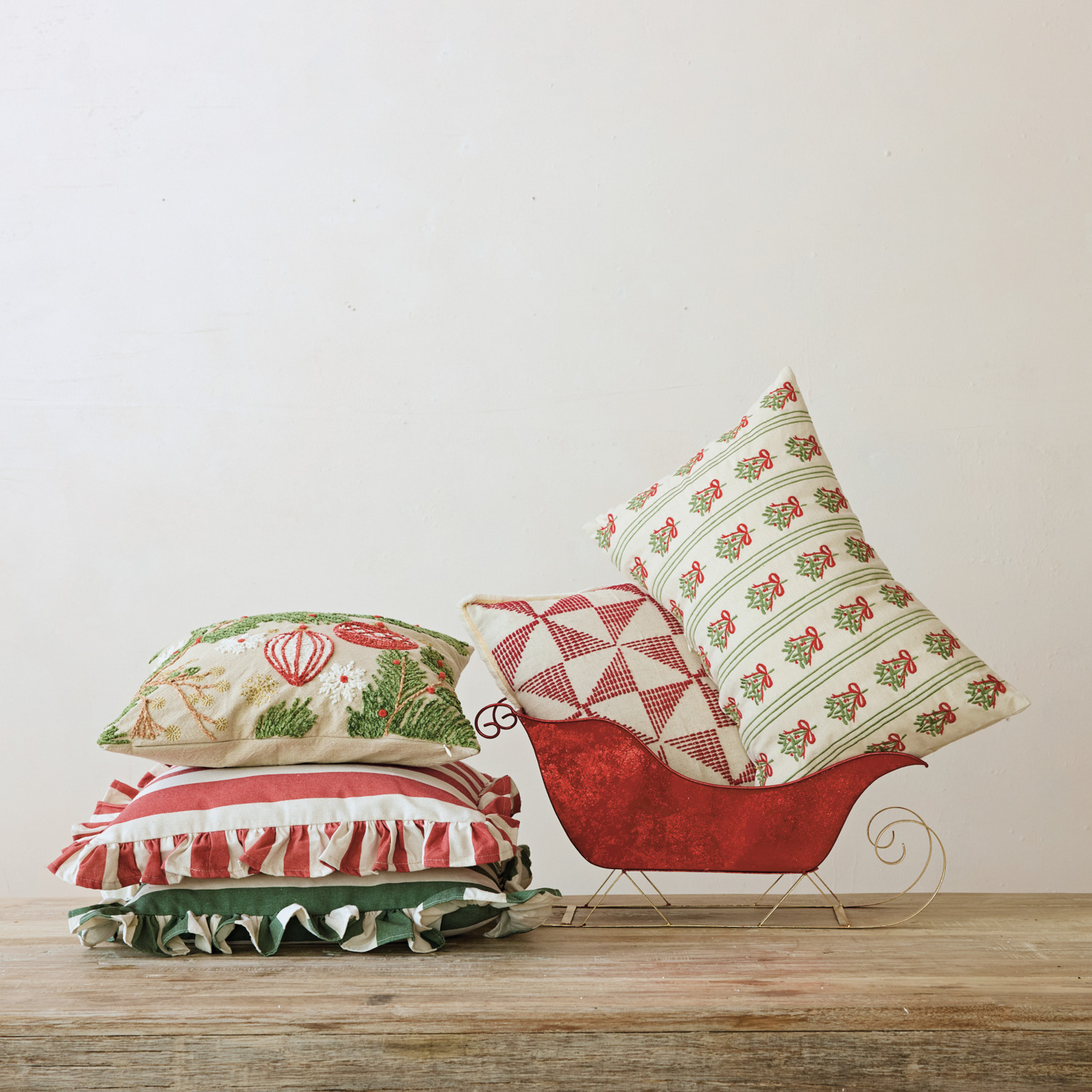 18" Square Cotton Pillow with Embroidered Pine Boughs, Ornaments & Snowflakes