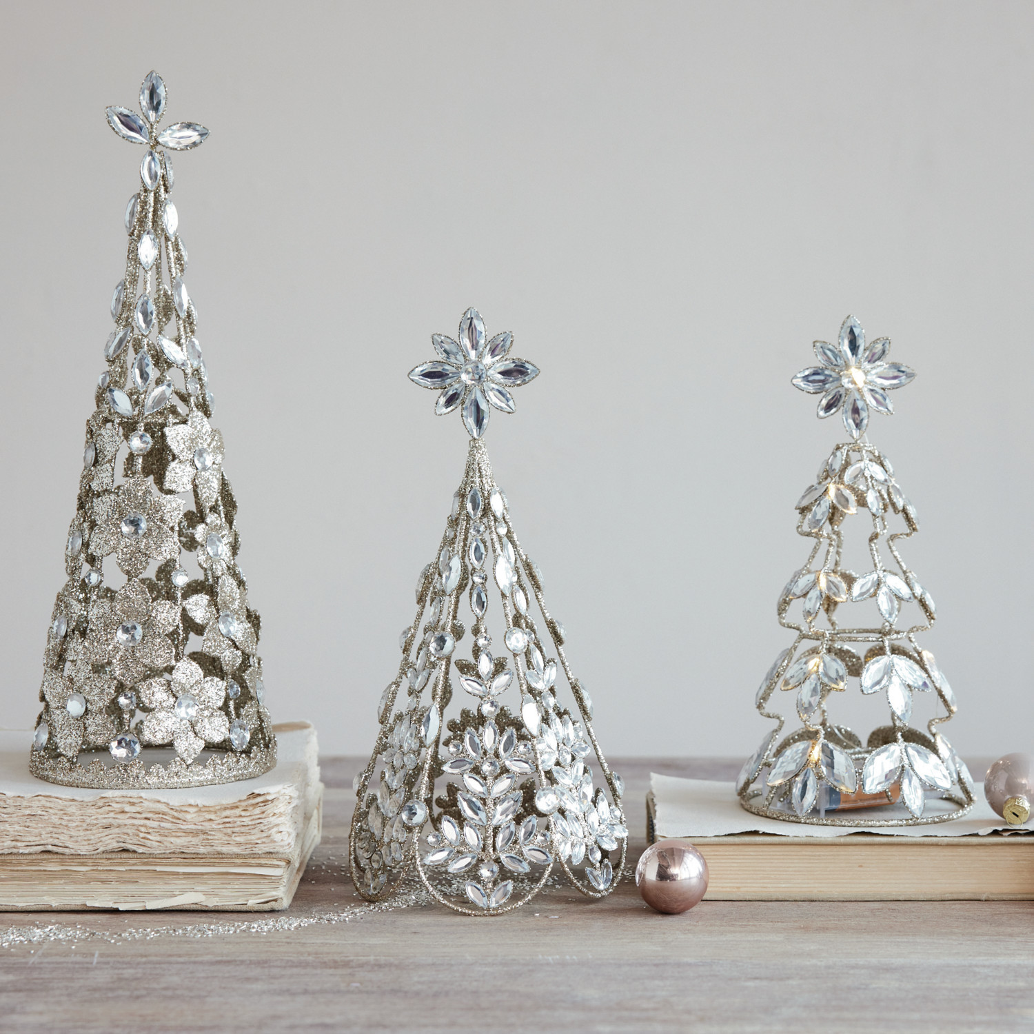 Catalog Name: 4-1/2" Round x 10-1/4"H Metal Tree w/ Acrylic Jewels, Glitter & LED Light, Champagne Finish (Requires 3-AA Batteries)