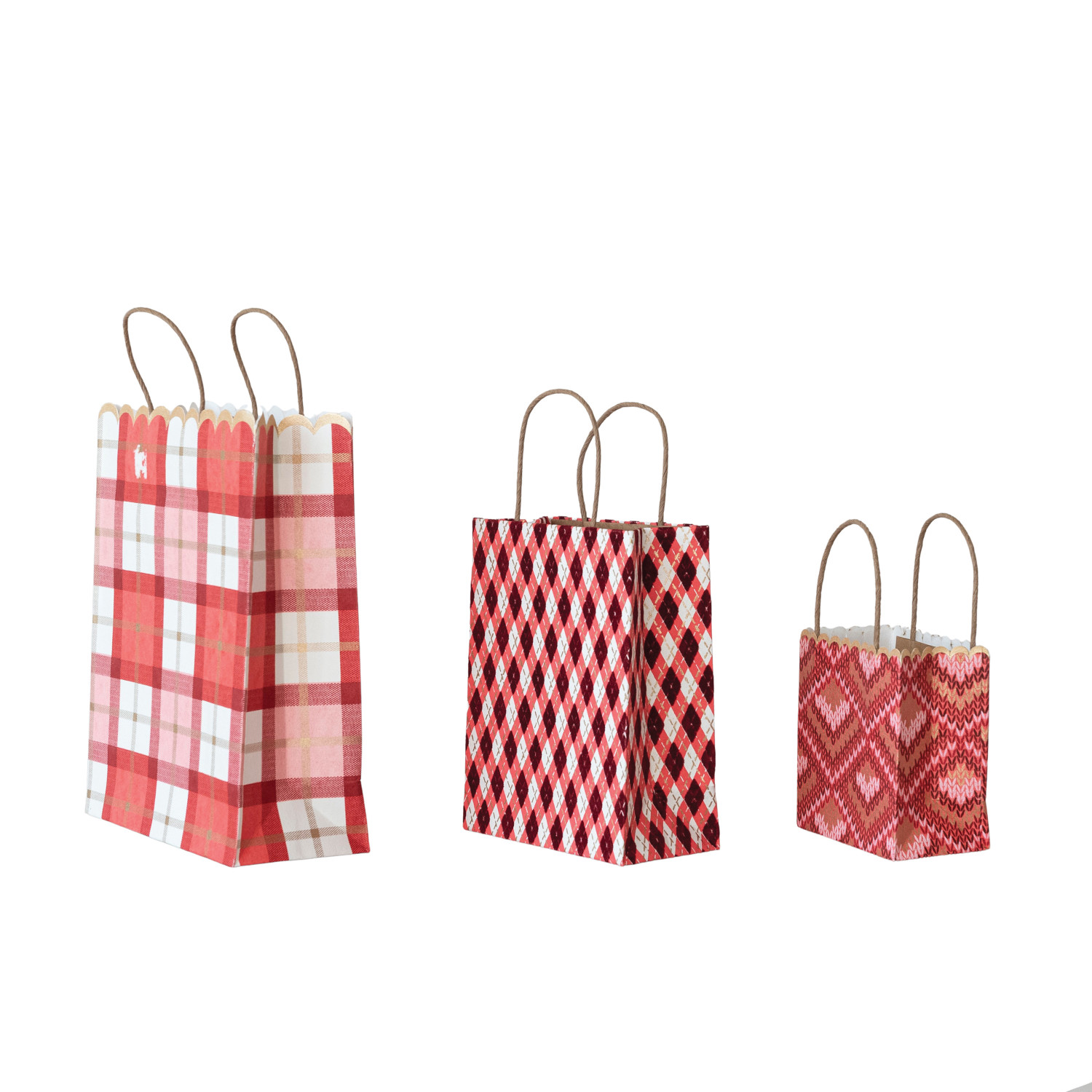 Catalog Name: 9"L x 4"W x 11-1/2"H, 6-1/2"L x 3-1/2"W x 8-1/2"H & 5"L x 3"W x 5-1/2"H Handmade Printed Scalloped Recycled Paper Gift Bags w/ Patterns, Multi Color, Set of 3