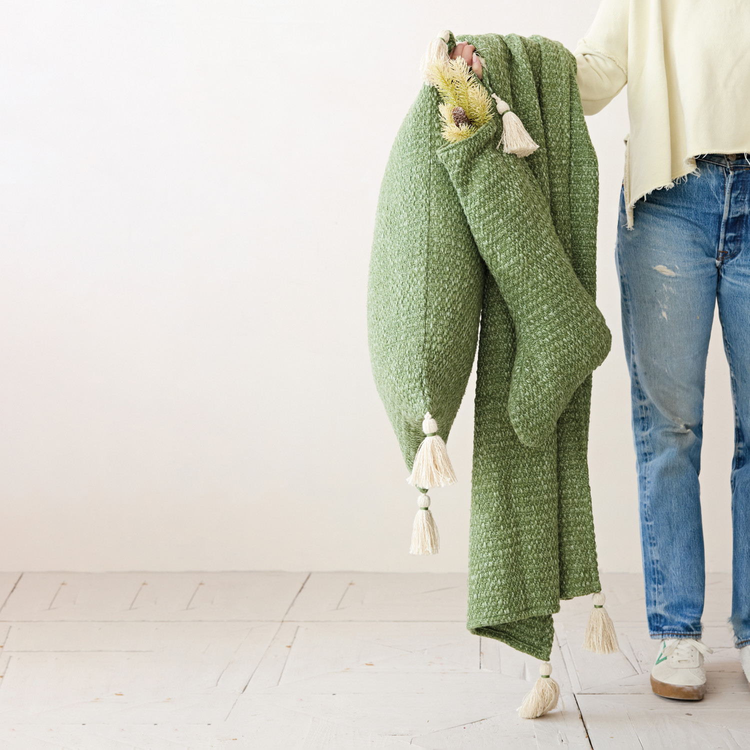Catalog Name: 60"L x 50"W Stonewashed Woven Cotton Blend Slub Throw w/ Tassels, Green & Cream Color