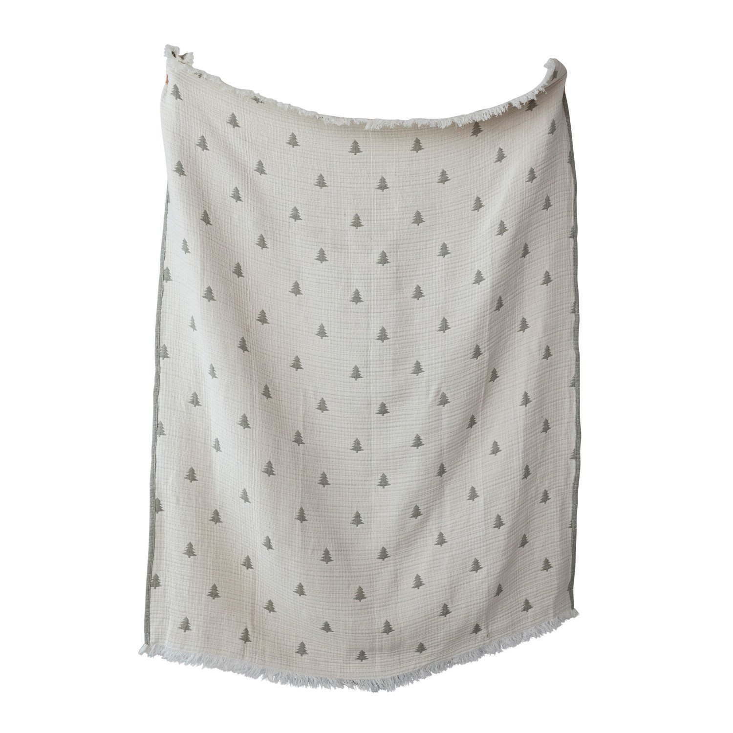 Cotton Double Cloth Throw with Trees, Eyelash Fringe & Hand-Embroidered Kantha Stitch
