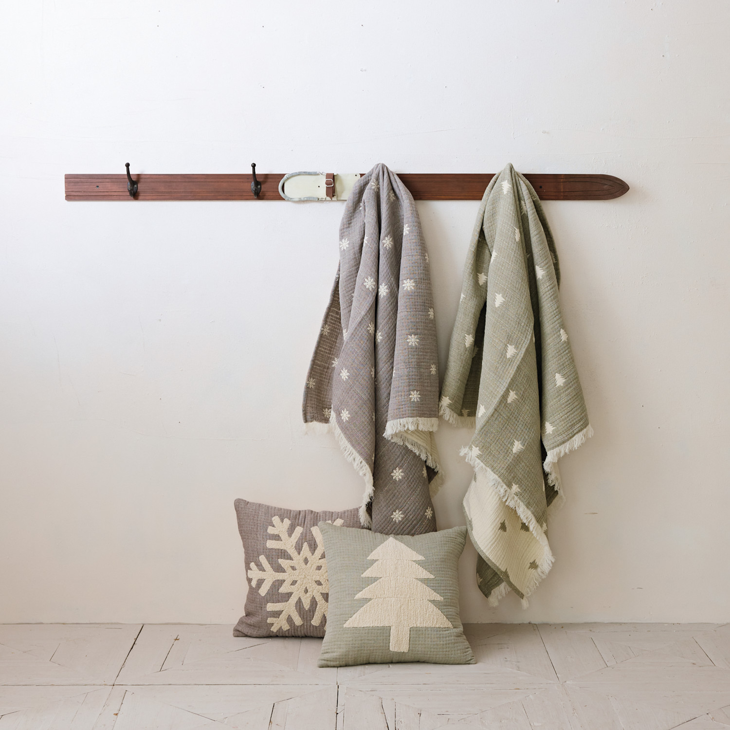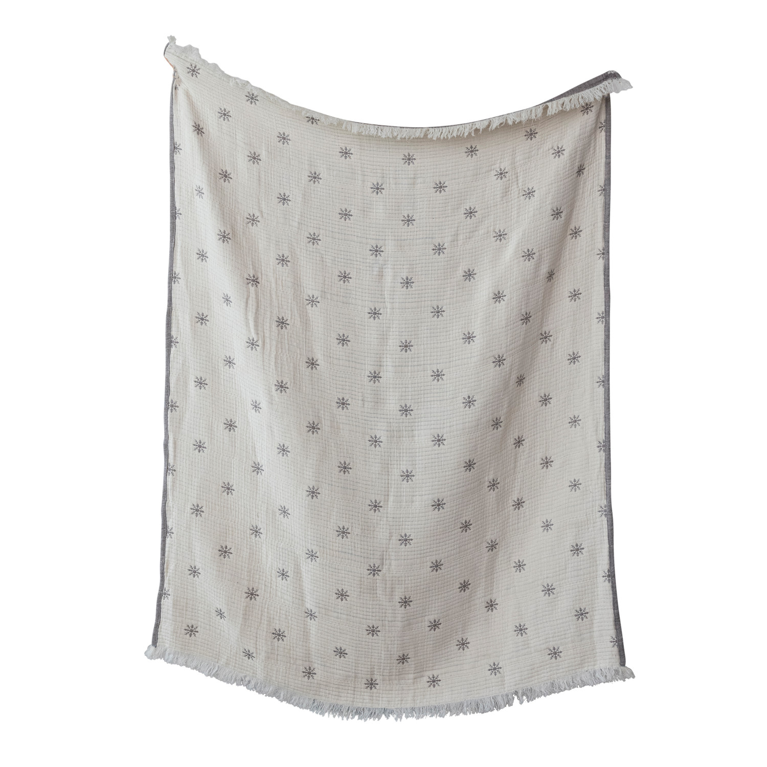 Cotton Double Cloth Throw with Snowflakes, Eyelash Fringe & Hand-Embroidered Kantha Stitch
