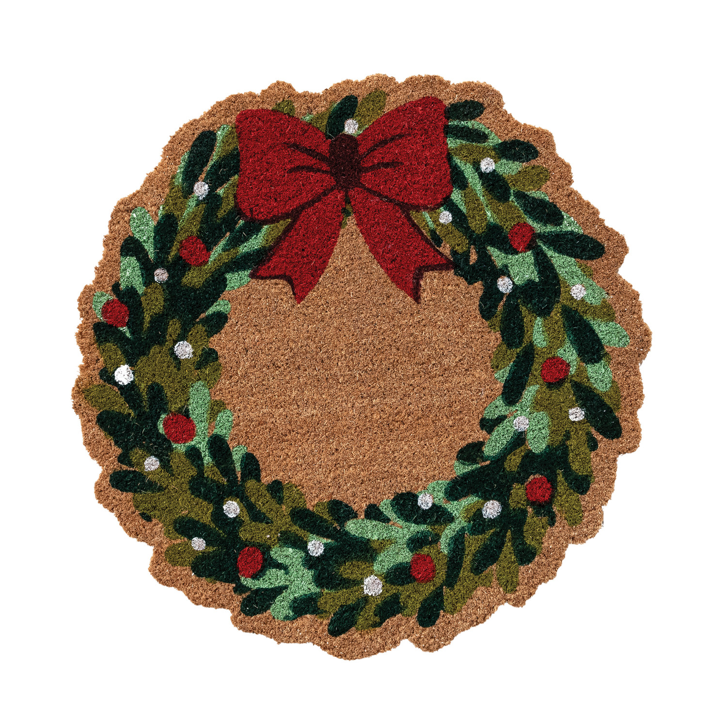 Catalog Name: 19-1/2" Round Natural Coir Wreath Shaped Doormat w/ Bow, Green, Red & White