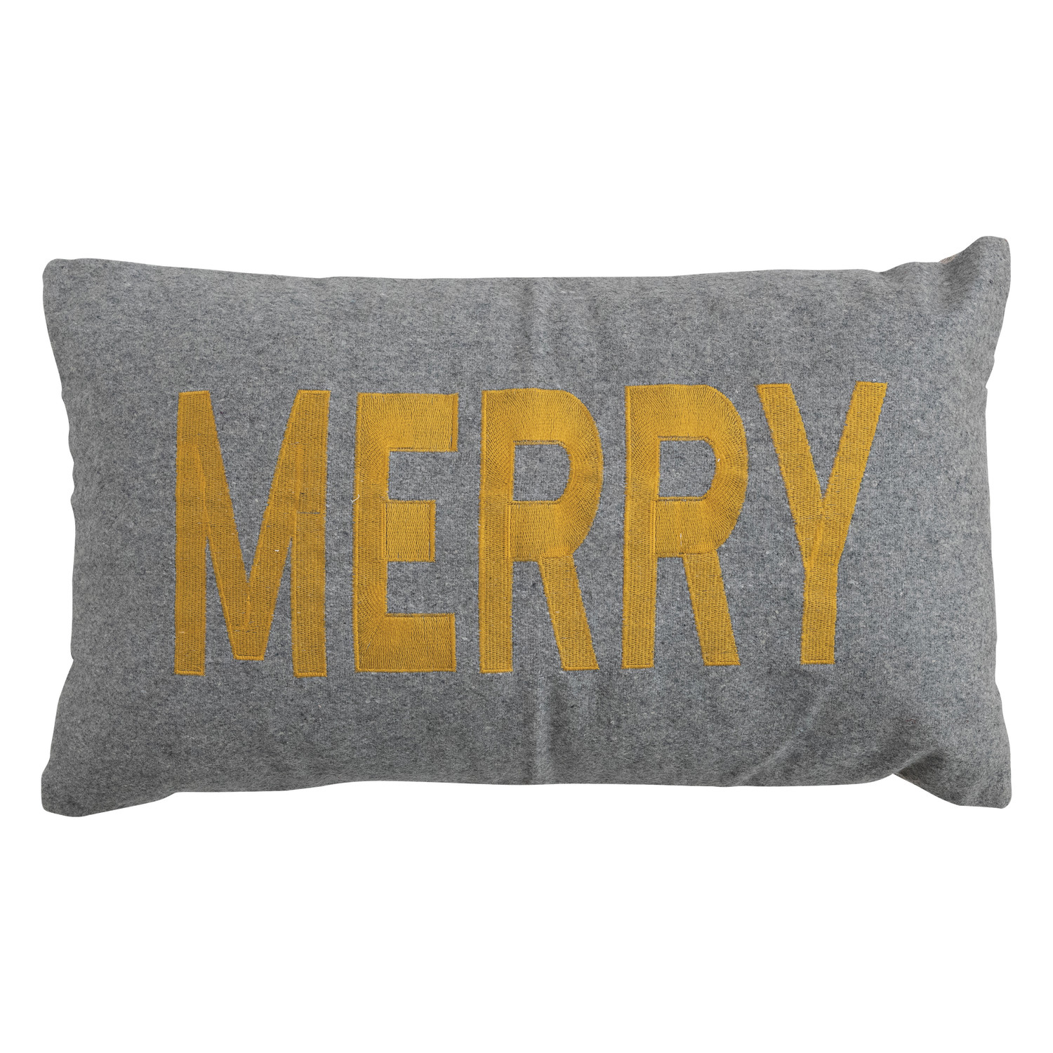 Catalog Name: 24"L x 14"H Recycled Wool Blend Lumbar Pillow w/ Chambray Back & Embroidered "Merry", Grey & Yellow