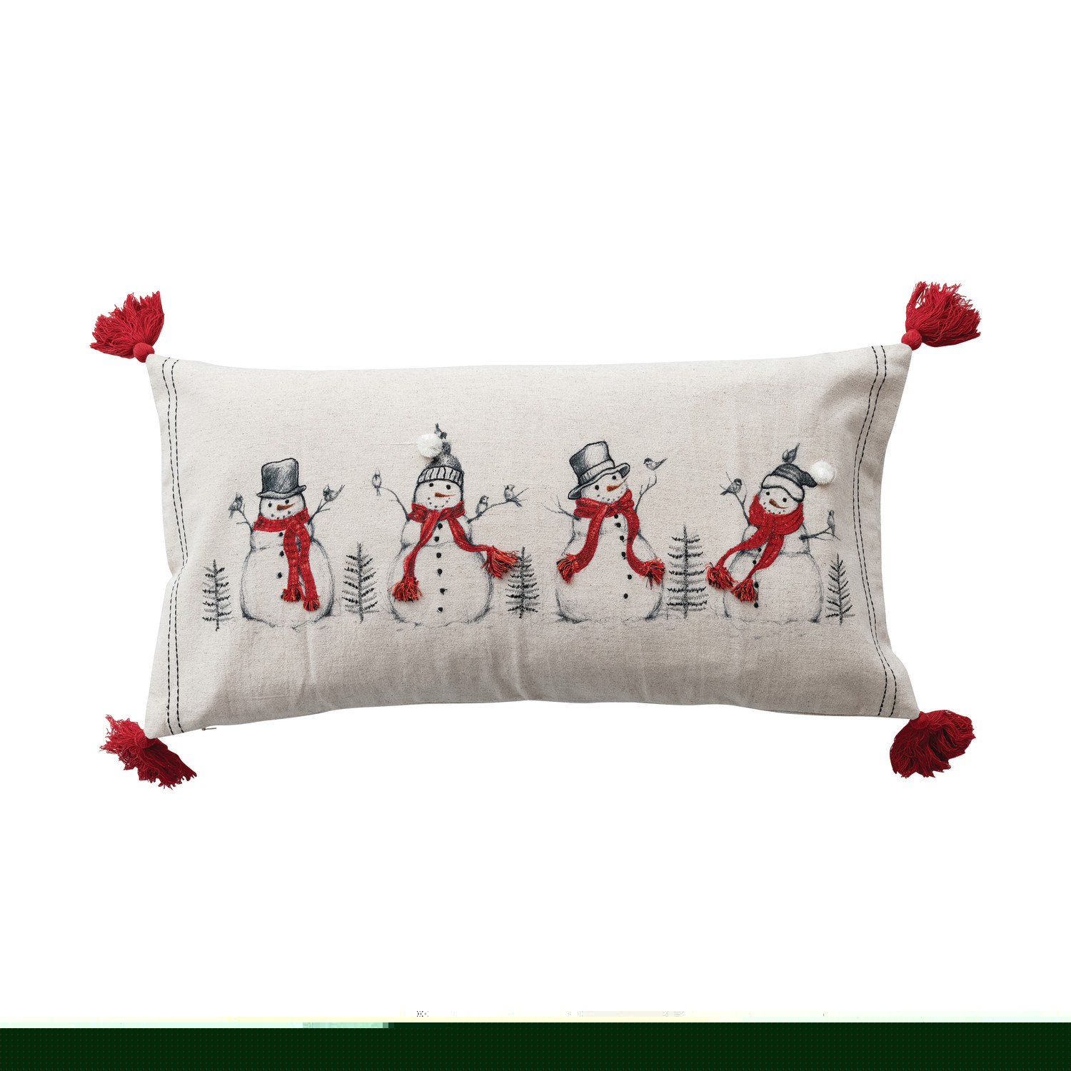 Catalog Name: 28"L x 14"H Cotton & Linen Printed Lumbar Pillow w/ Embroidered Snowmen & Birds Image, Pompoms & Tassels, Multi Color ©