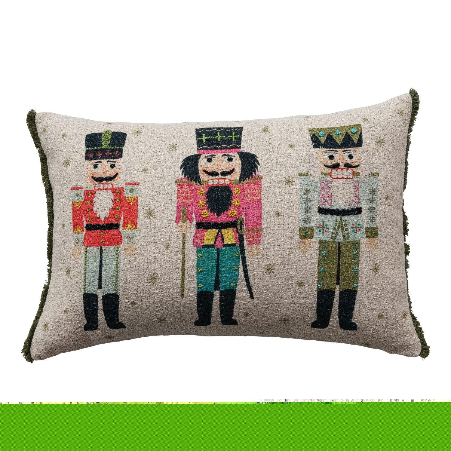 Catalog Name: 20"L x 14"H Cotton Slub Printed Lumbar Pillow w/ Nutcrackers, Beads & Tufted Fringe, Multi Color