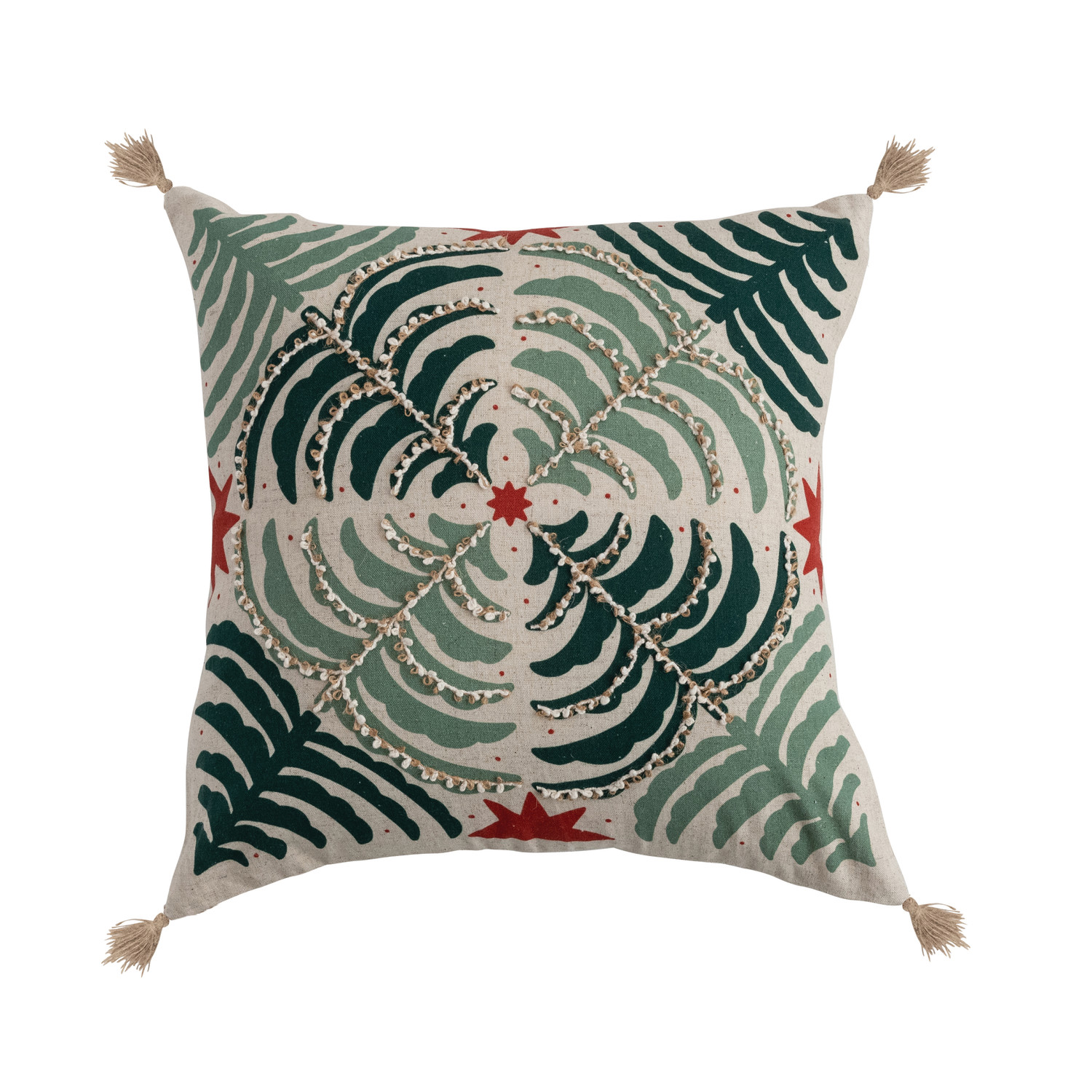 Catalog Name: 18" Square Cotton & Linen Printed Pillow w/ Tree Pattern, Embroidery & Jute Tassels, Multi Color
