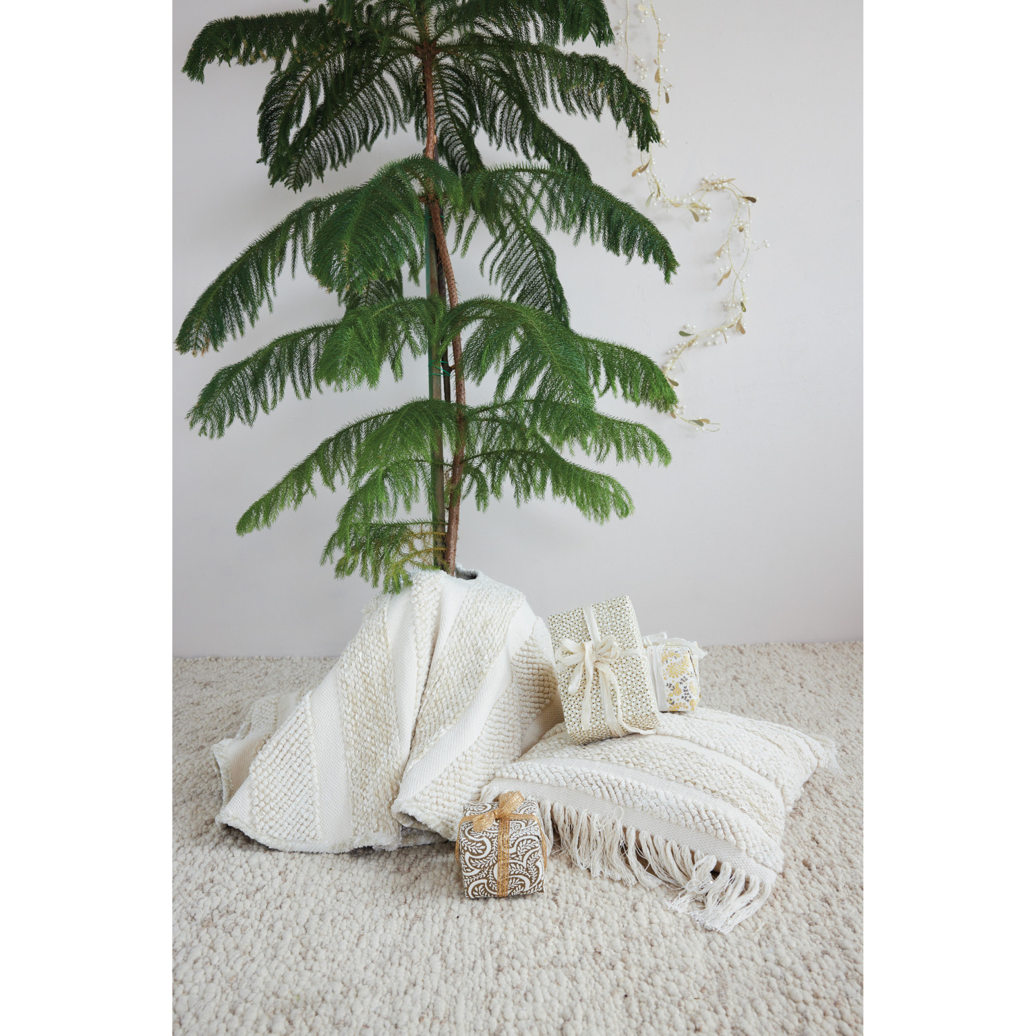 Catalog Name: 48" Round Woven Cotton & Fabric Blend Striped Tree Skirt w/ Metallic Gold Thread Embroidery & Ties, Natural