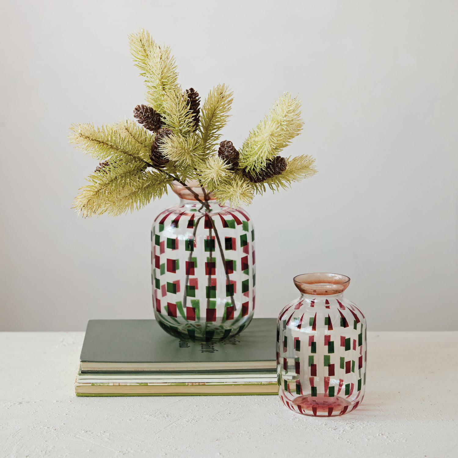 Catalog Name: 5" Round x 7-1/2"H Painted Glass Vase w/ Geometric Pattern, Red & Green