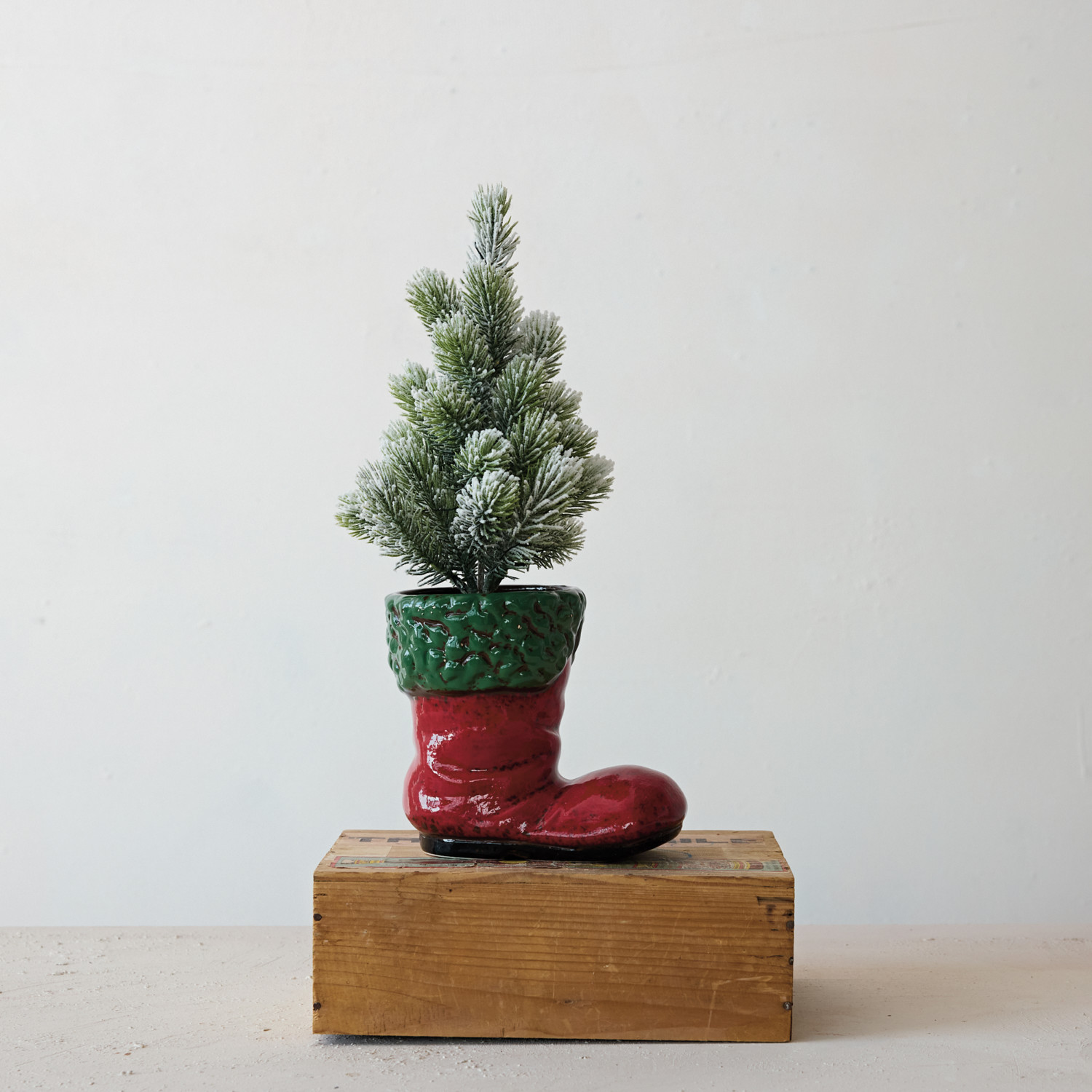 Catalog Name: 6-1/4"L x 4-1/4"W x 5-1/2"H Hand-Painted Ceramic Santa Boot Shaped Container, Reactive Glaze, Red & Green (Each One Will Vary)