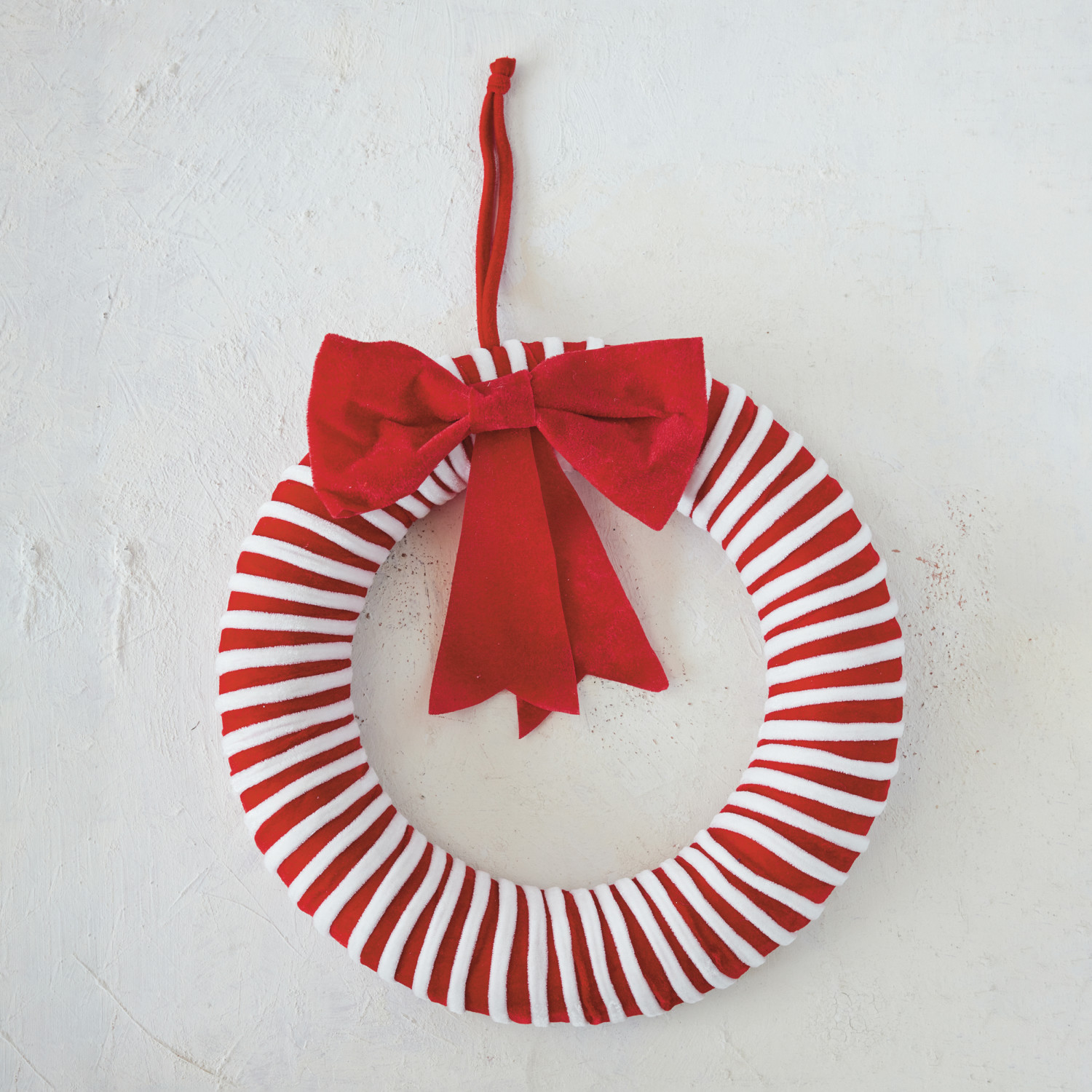 Fabric & Foam Striped Wreath with Bow, Red & White