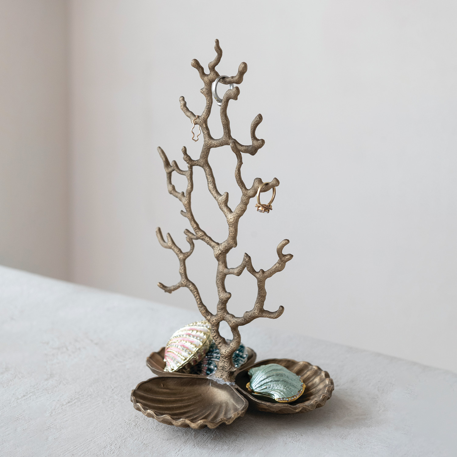 Metal Coral Shaped Jewelry Holder with Shell Shaped Base & 3 Sections, Antique Brass Finish