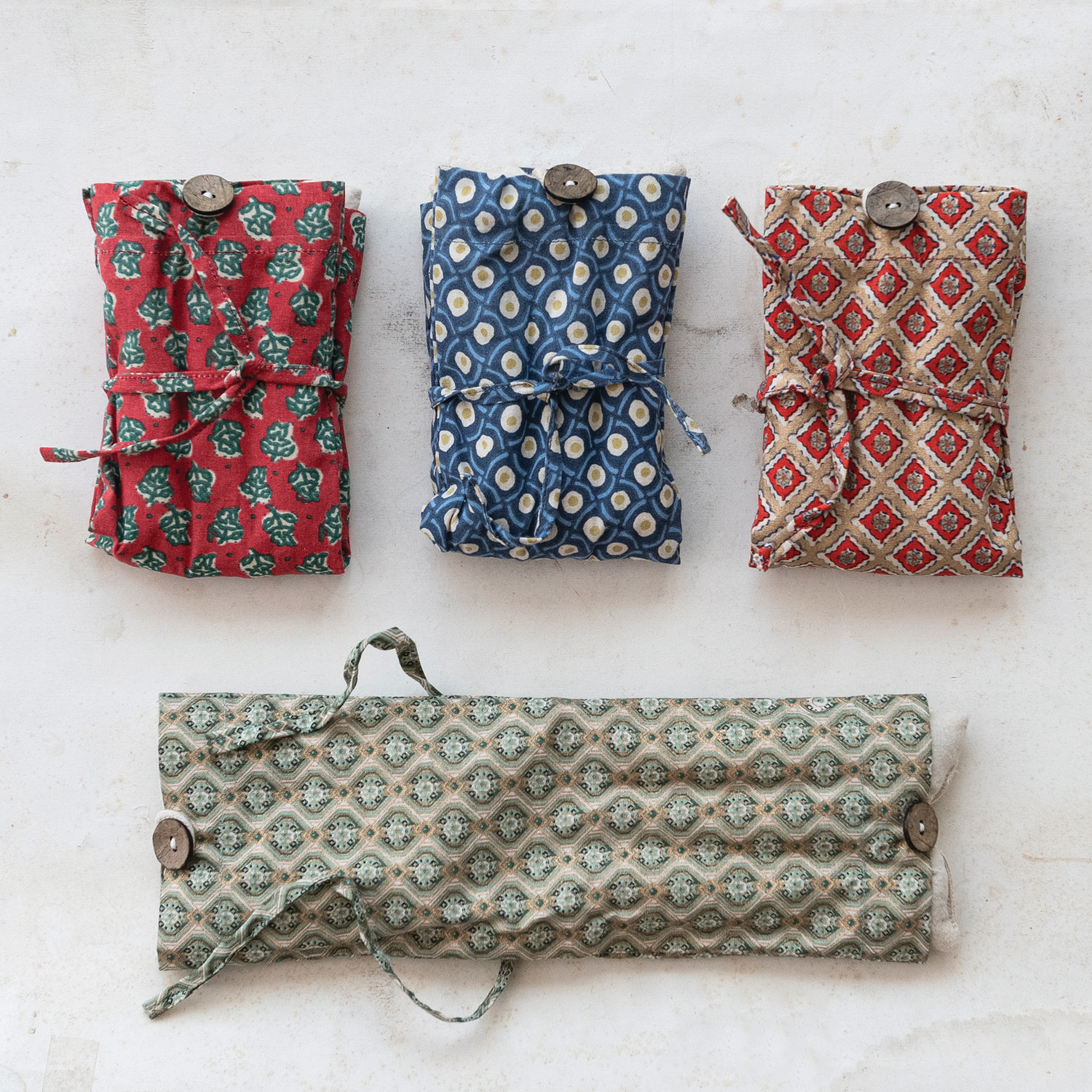 Catalog Name: 12"L x 4"W Microwaveable Hot/Cold Pack w/ Coconut Shell Buttons & Cotton Printed Cover Filled w/ Natural Lentils & Lavender Tied w/ Printed Cotton Tape, Multi Color, 4 Styles