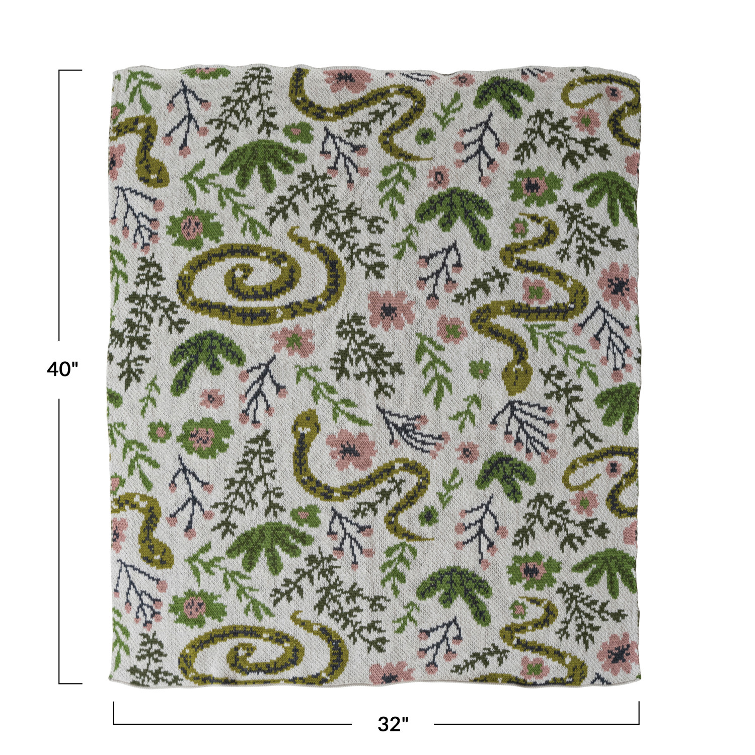 Catalog Name: 40"L x 32"W Cotton Knit Baby Blanket w/ Snakes & Florals, Multi Color
