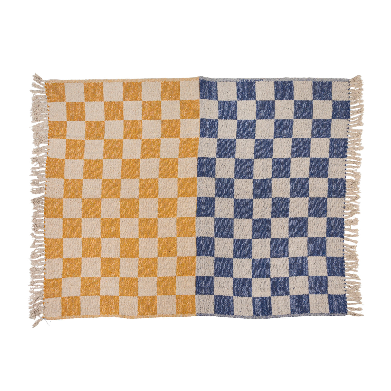 Catalog Name: 60"L x 50"W Woven Recycled Cotton Blend Throw w/ Check Pattern & Fringe, Yellow, Blue & Natural