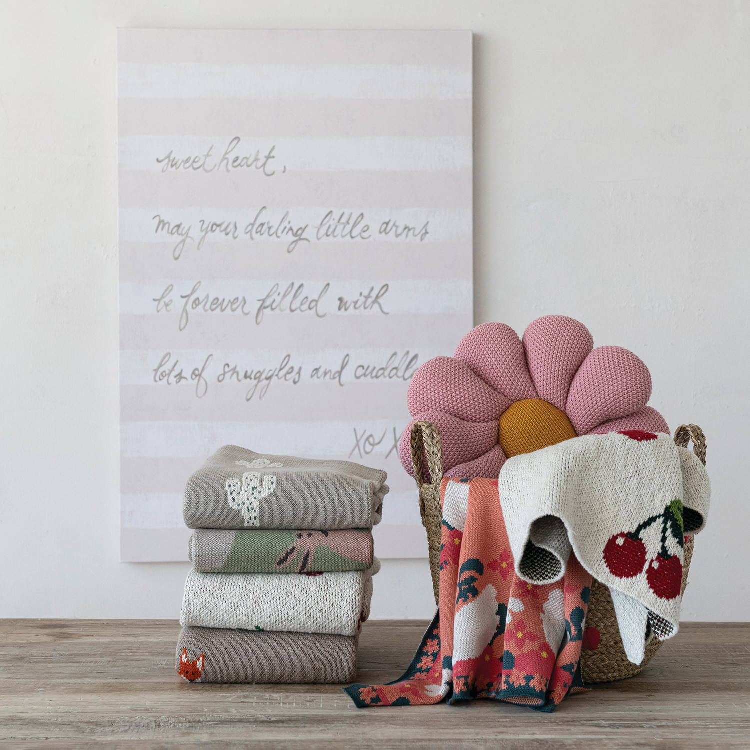 Cotton Knit Baby Blanket with Swans & Flowers