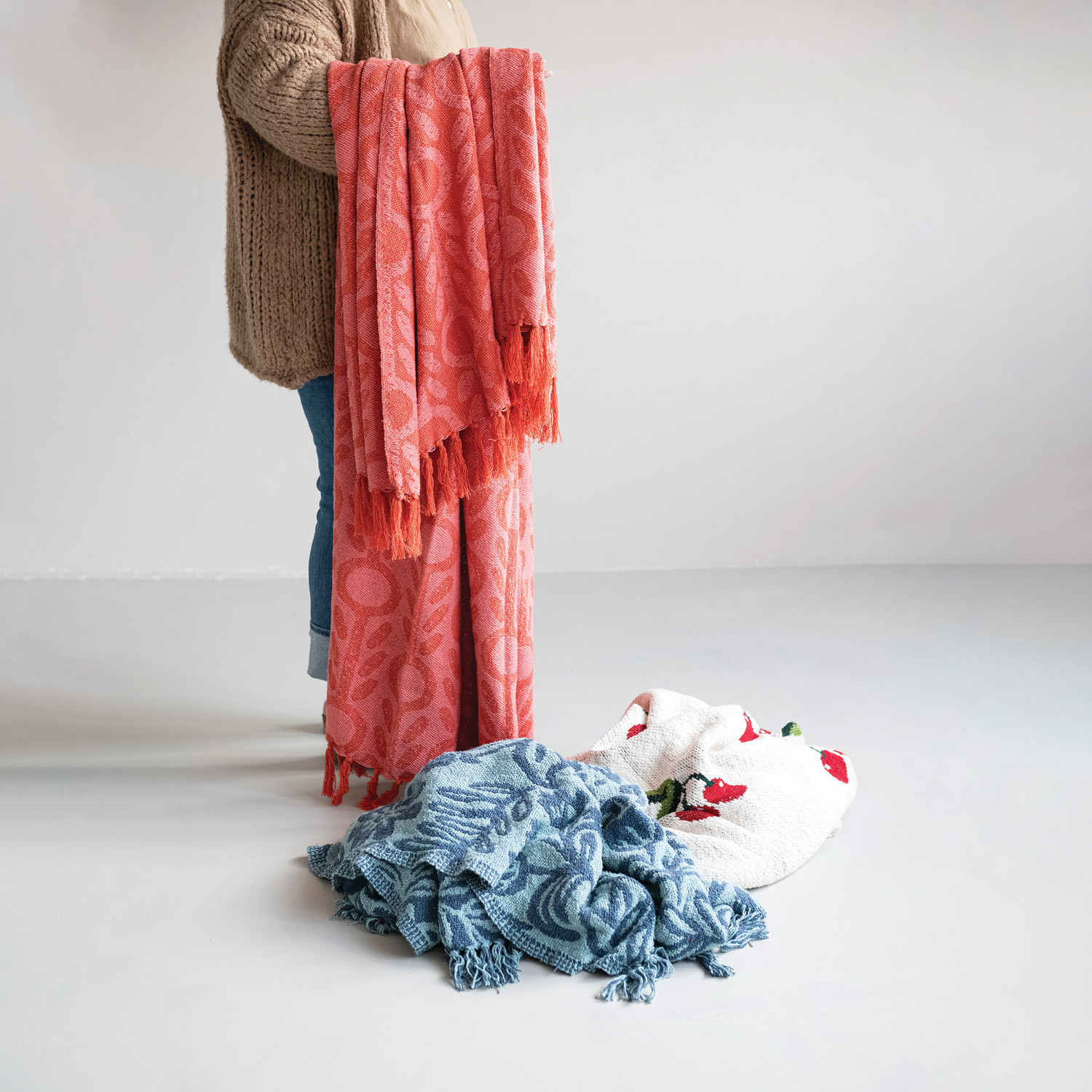 60"L x 50"W Woven Recycled Cotton Blend Jacquard Throw with Floral Pattern & Fringe