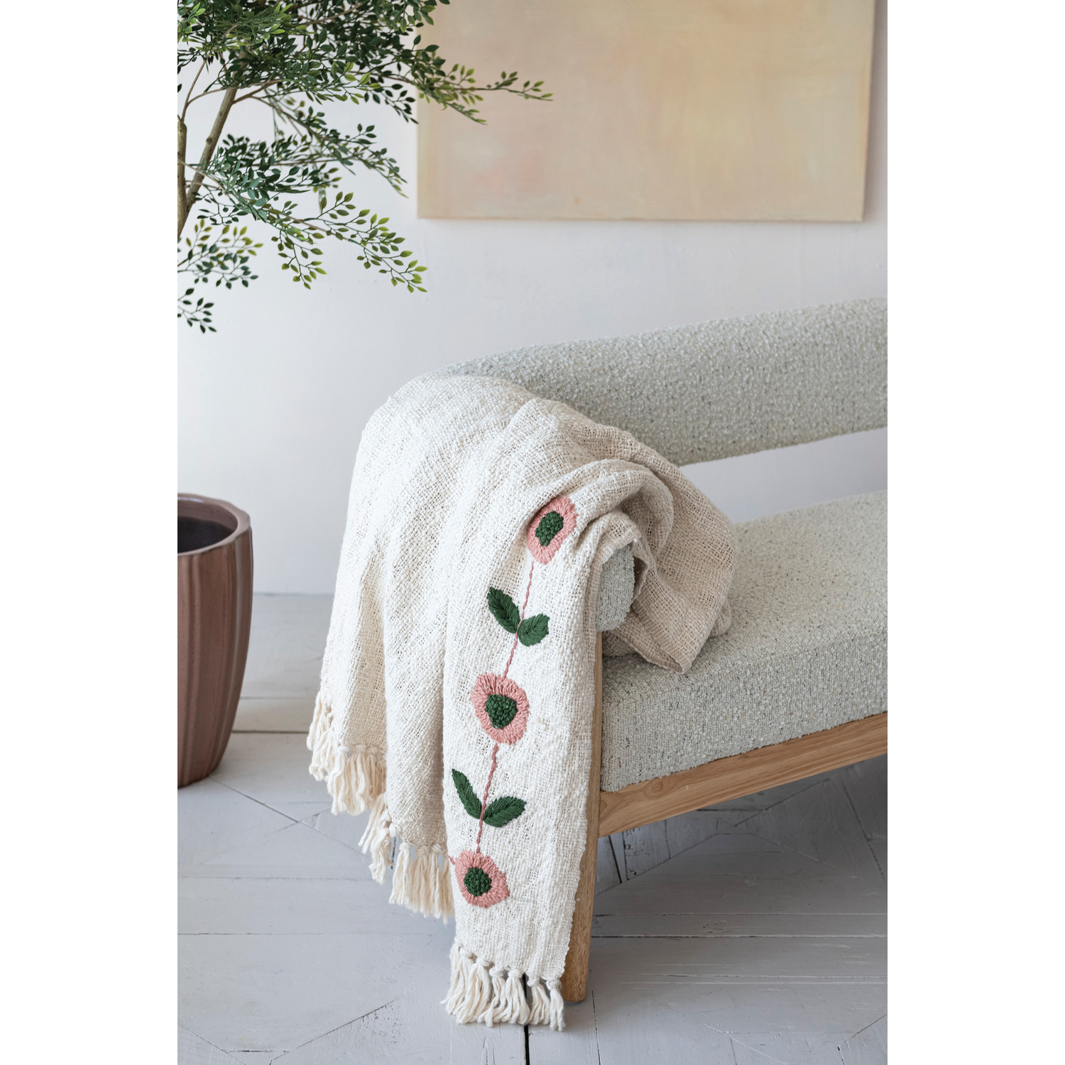 60"L x 50"W Woven Cotton Slub Throw with Hand-Embroidered Flowers & Fringe