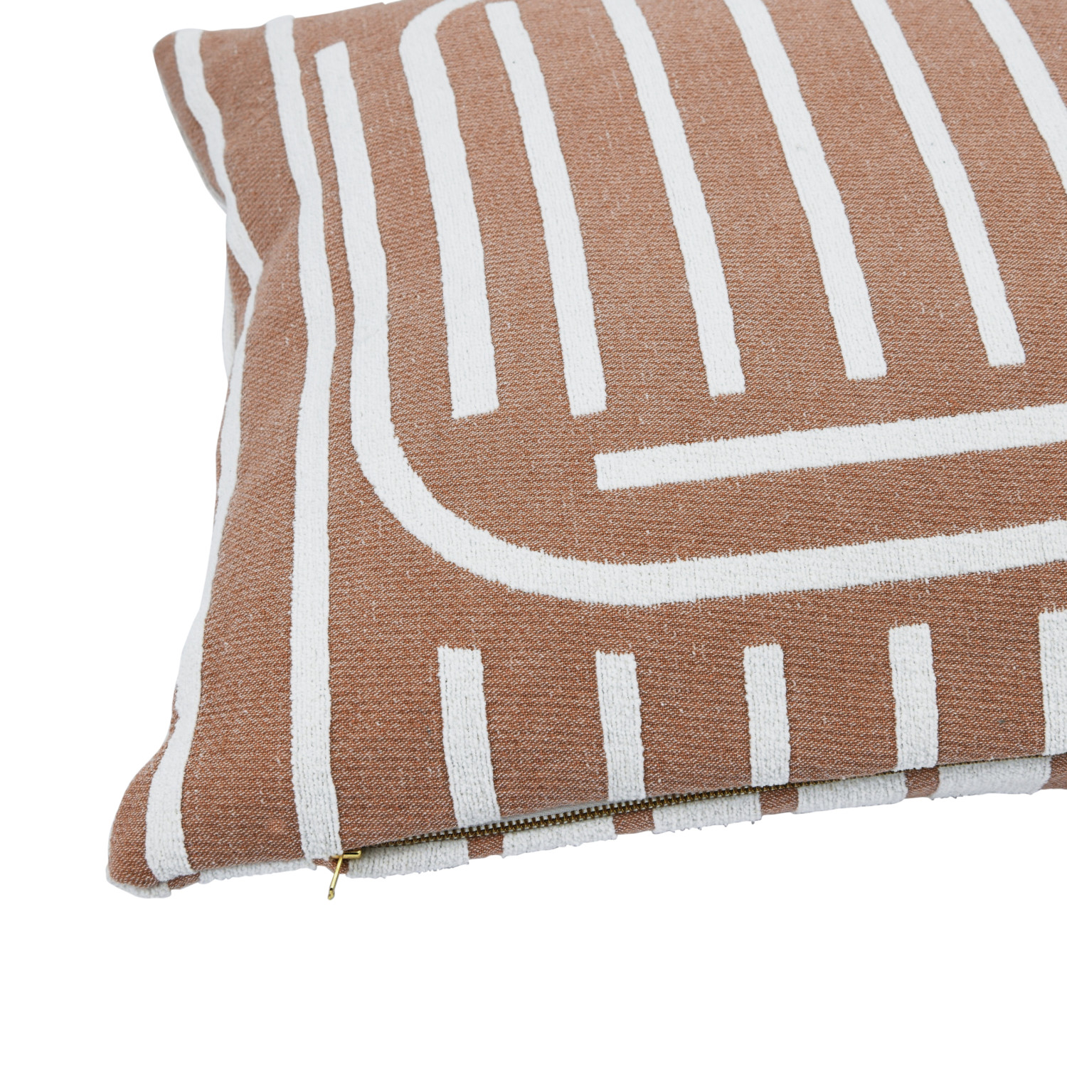 This contemporary throw pillow cover features a geometric line print on durable woven cotton. Square putty and cream cotton throw pillow with geometric line print; Inverse print on back. Express your constantly evolving style with the simple addition of this eye-catching pillow. Removable cotton throw pillow cover with polyester insert; Hidden in seam zipper closure; Machine wash cold, gentle cycle, do not bleach, warm iron if needed.