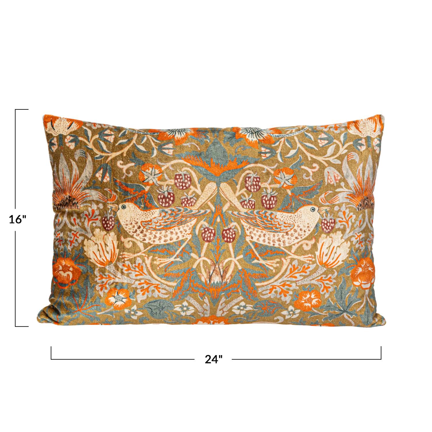 Catalog Name: 24"L x 16"H Cotton Velvet Printed Lumbar Pillow w/ Birds/Floral Pattern & Cotton Back, Multi Color