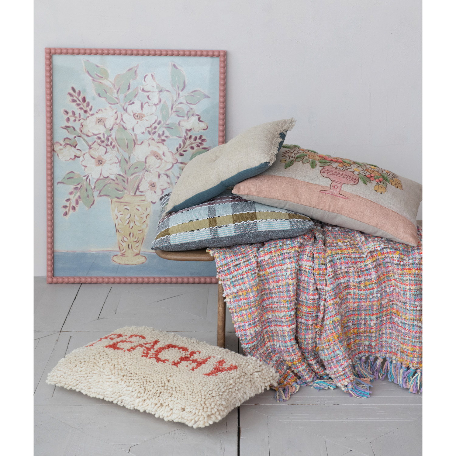 Linen Blend Printed Lumbar Pillow w/ Flowers in Vase, Embroidery, Pom Poms & Chambray Back ©
