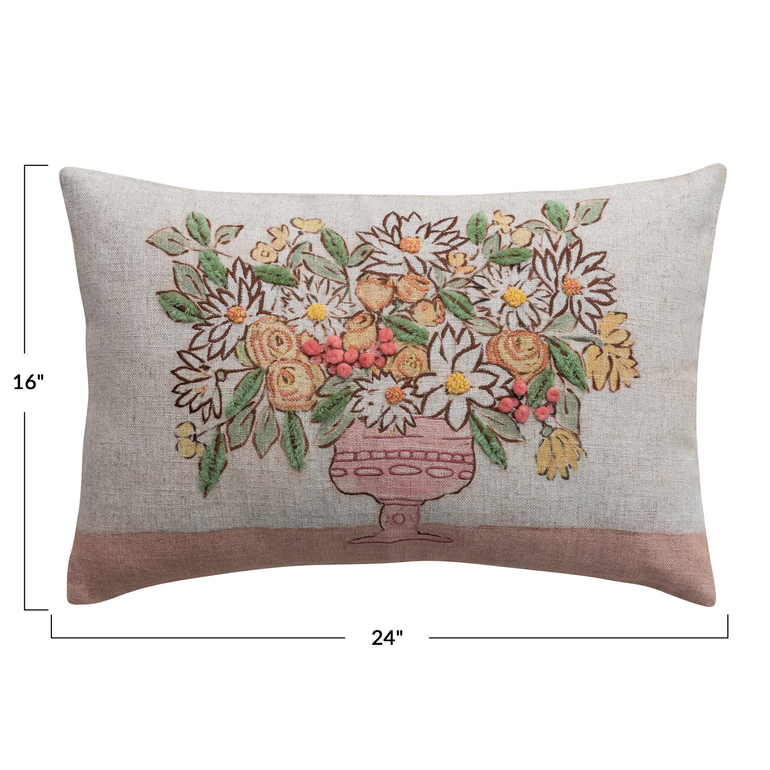 Catalog Name: 24"L x 16"H Linen Blend Printed Lumbar Pillow w/ Flowers in Vase, Embroidery, Pom Poms & Chambray Back, Multi Color ©