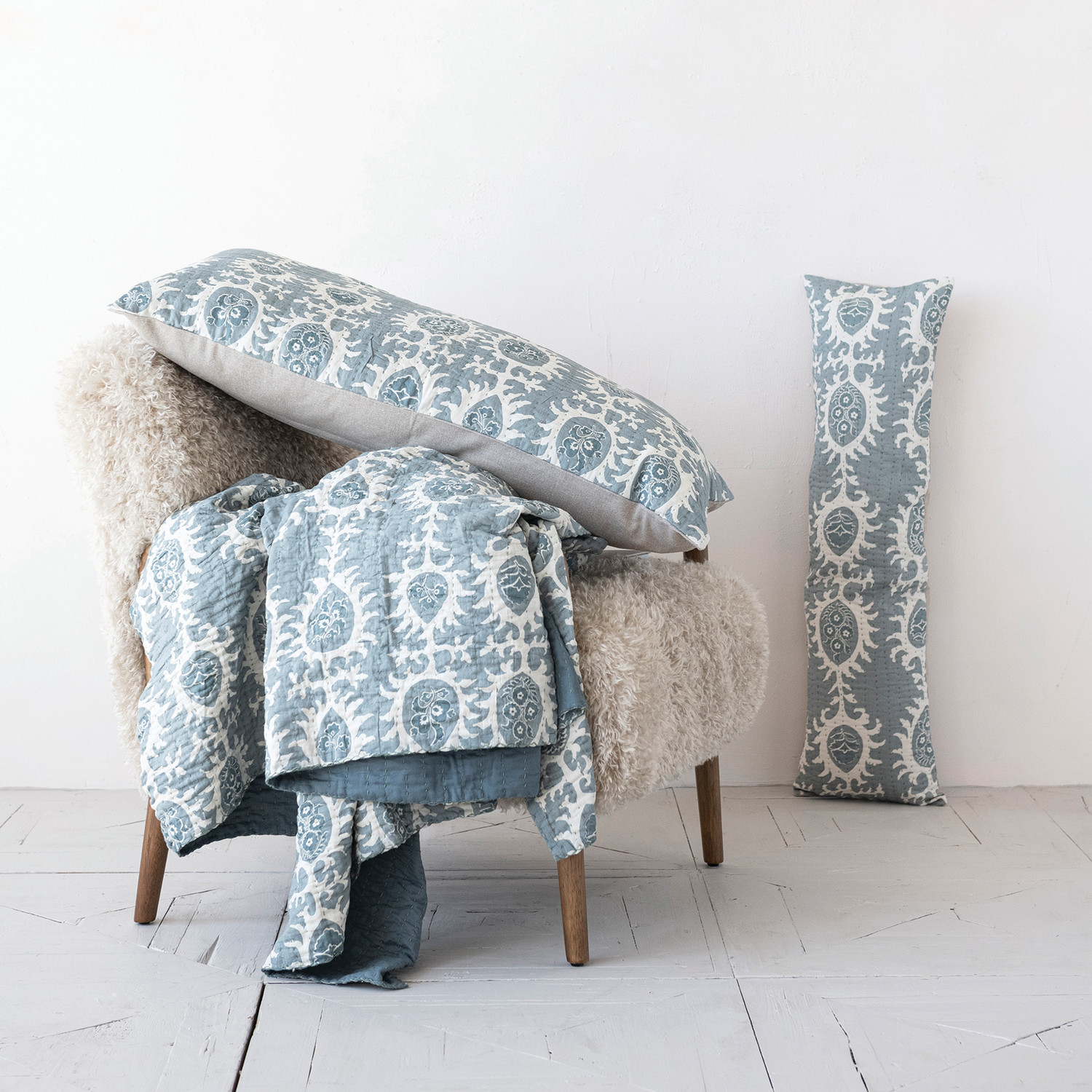 Cotton Voile Lumbar Pillow with Pattern, Hand-Embroidered Kantha Stitch & Chambray Back