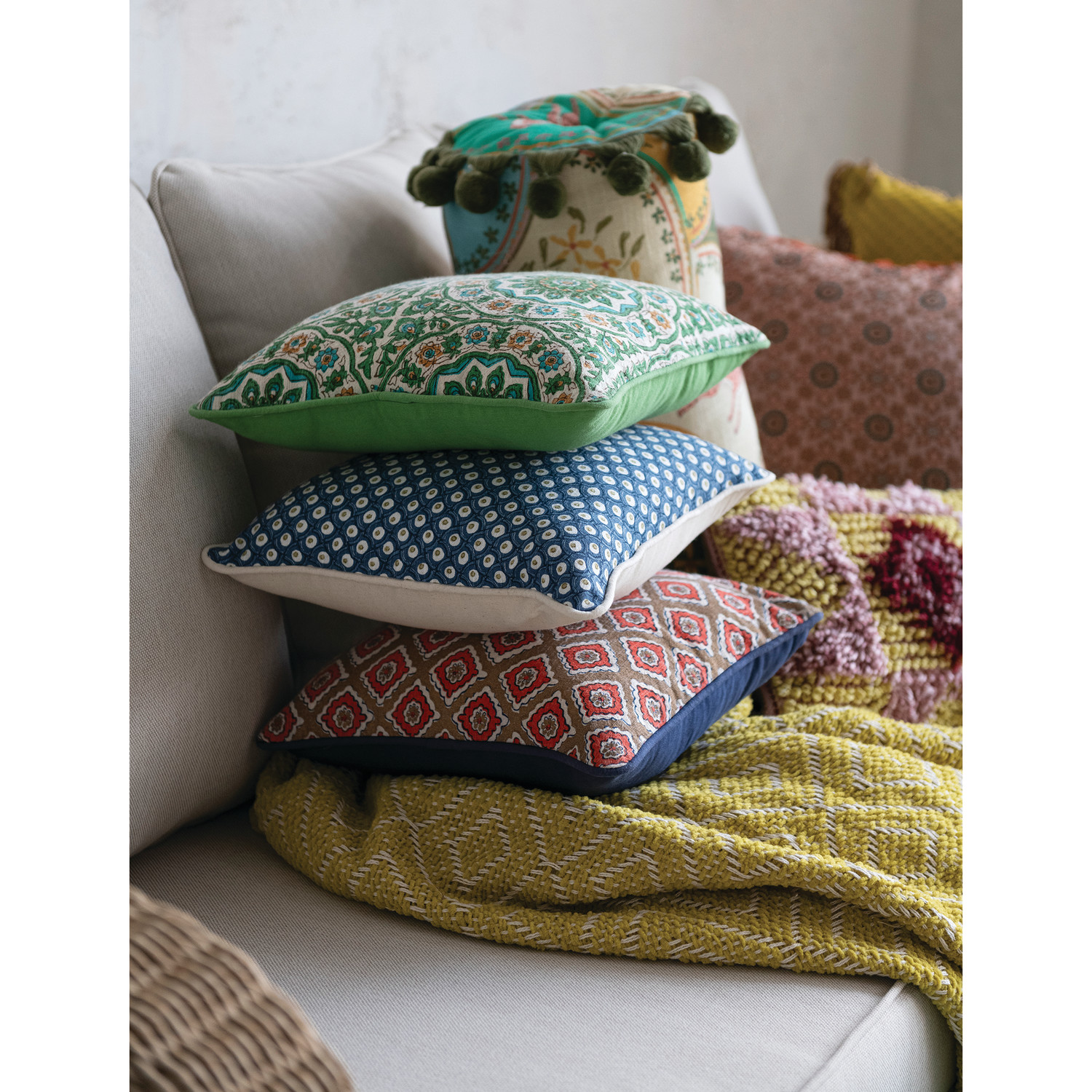 12" Square Cotton Slub Pillow with Block Print Pattern & Piping, 3 Styles