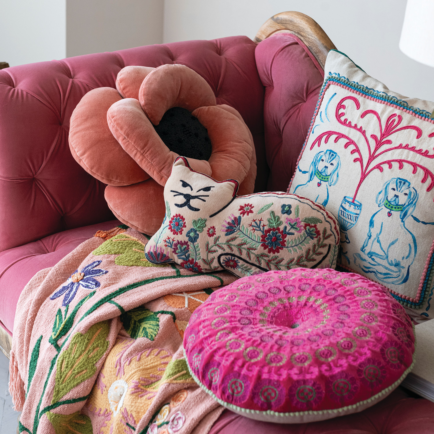 Catalog Name: 16" Round Cotton Velvet 3D Flower Shaped Pillow w/ Beads, Peach Color & Brown