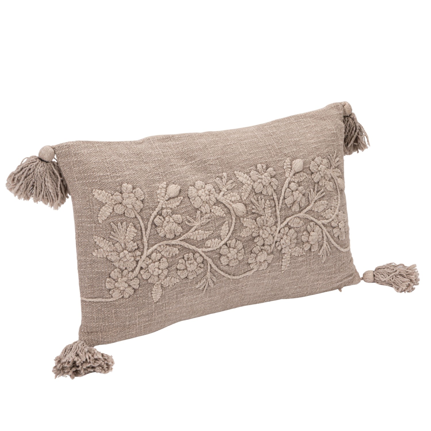 Catalog Name: 20"L x 12"H Stonewashed Cotton Slub Lumbar Pillow w/ Embroidered Flowers & Tassels, Taupe