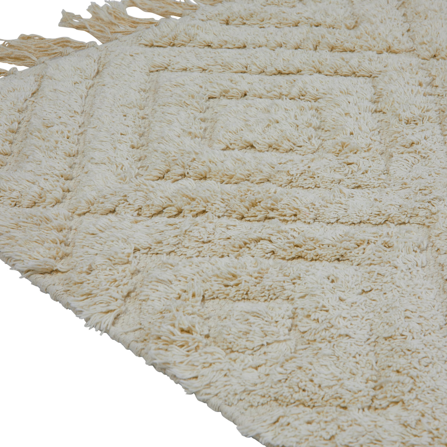 This cozy throw rug features a tufted diamond pattern on supple cotton with decorative fringe. Cream cotton tufted rug with diamond pattern and fringe. Spot Clean Only. 97% Cotton, 3% Other Fibers.