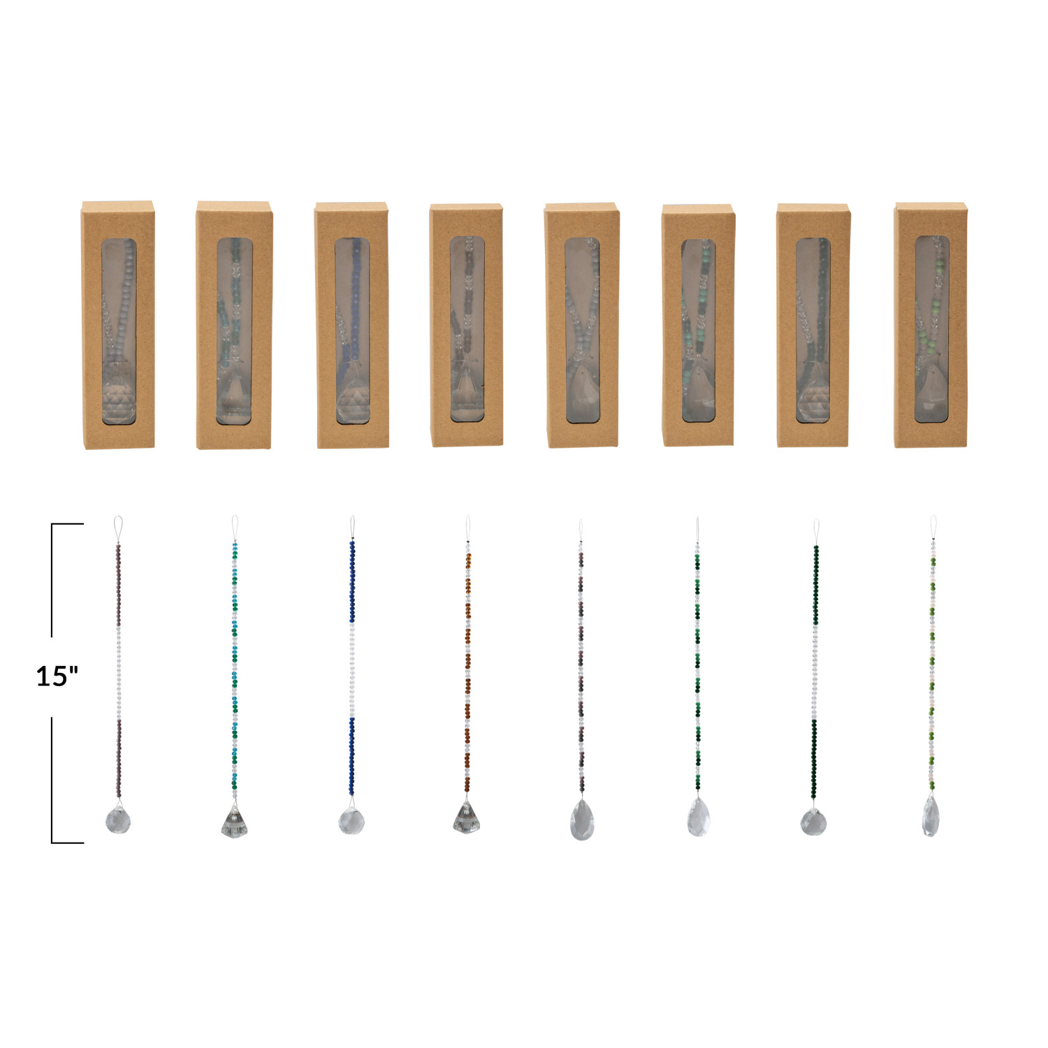 Catalog Name: 13-1/4"L - 15"L Crystal Hanging Beaded Drop in Kraft Box, Multi Color, 8 Styles