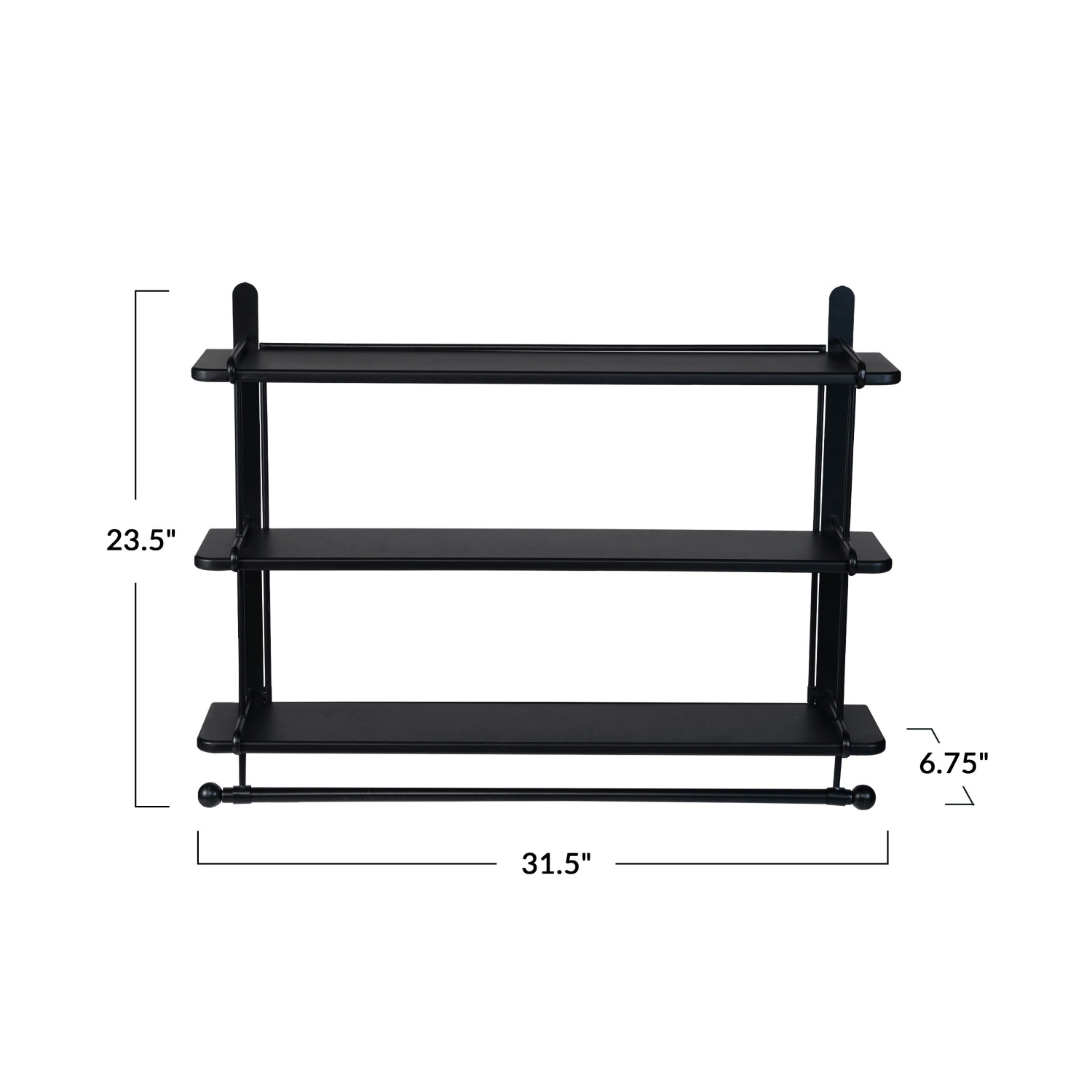 Wood & Metal Wall Shelf w/ 3 Shelves & Rod, Black, KD
